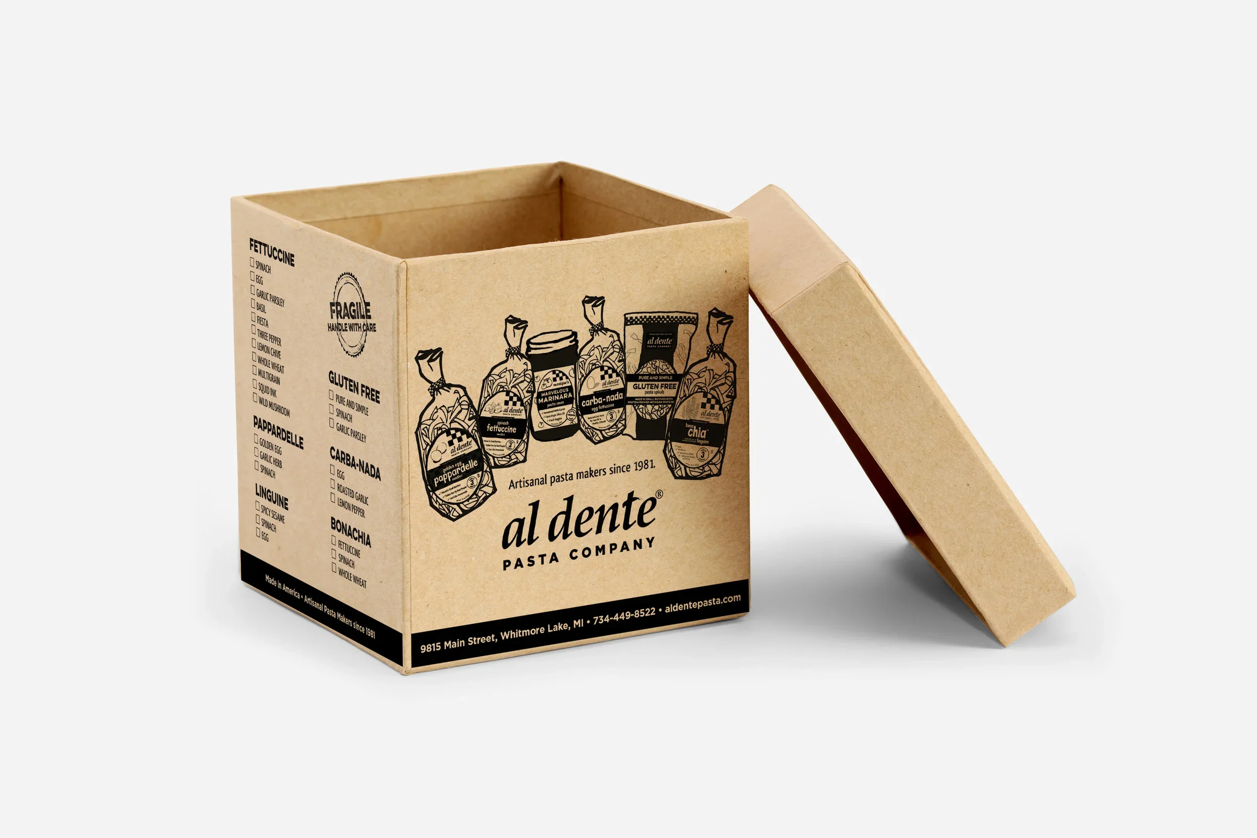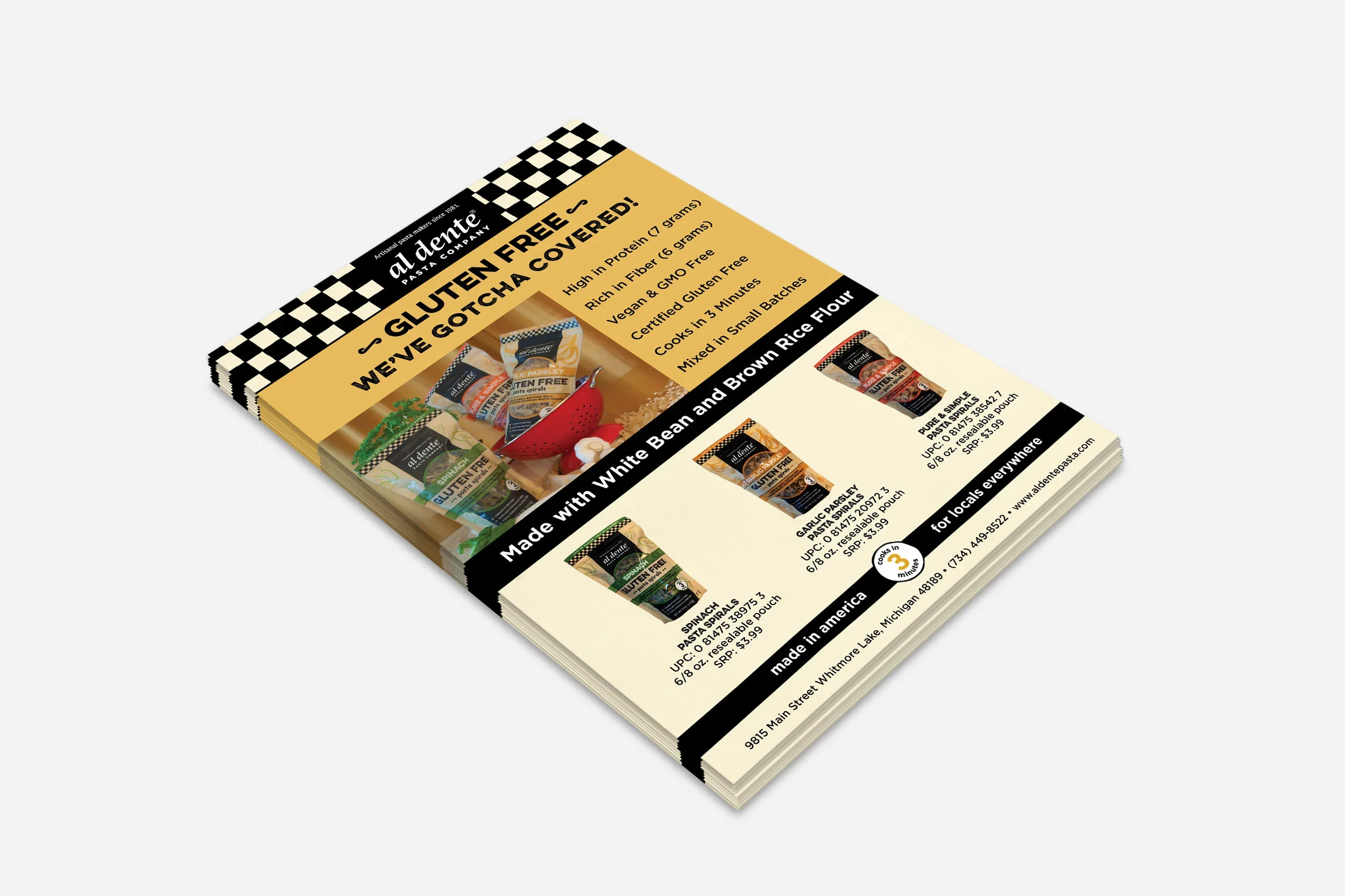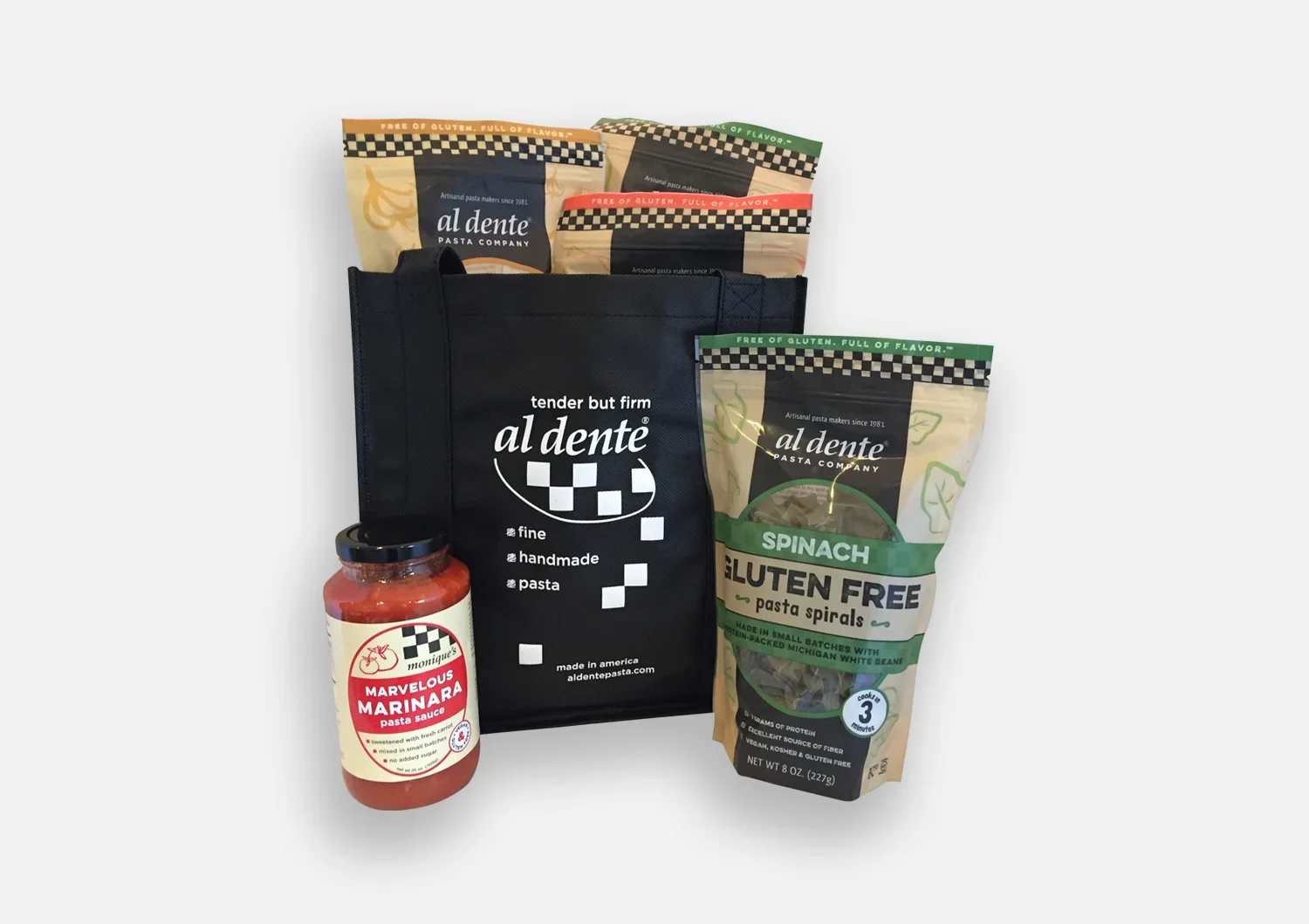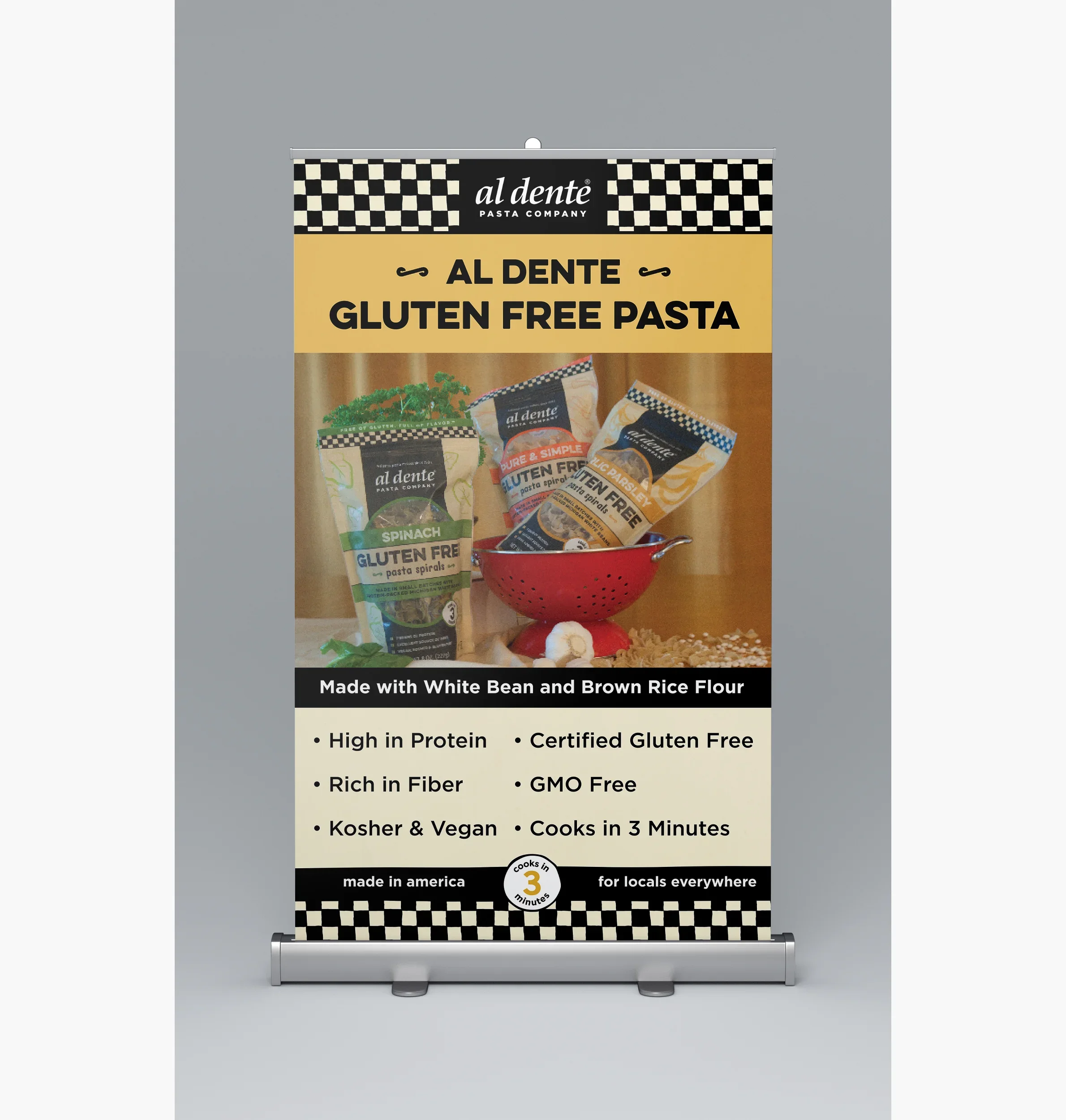 Marketing materials for Al Dente Pasta Company's new gluten free pasta. Includes: shipping materials, sell sheets, tote bag and trade show signage.