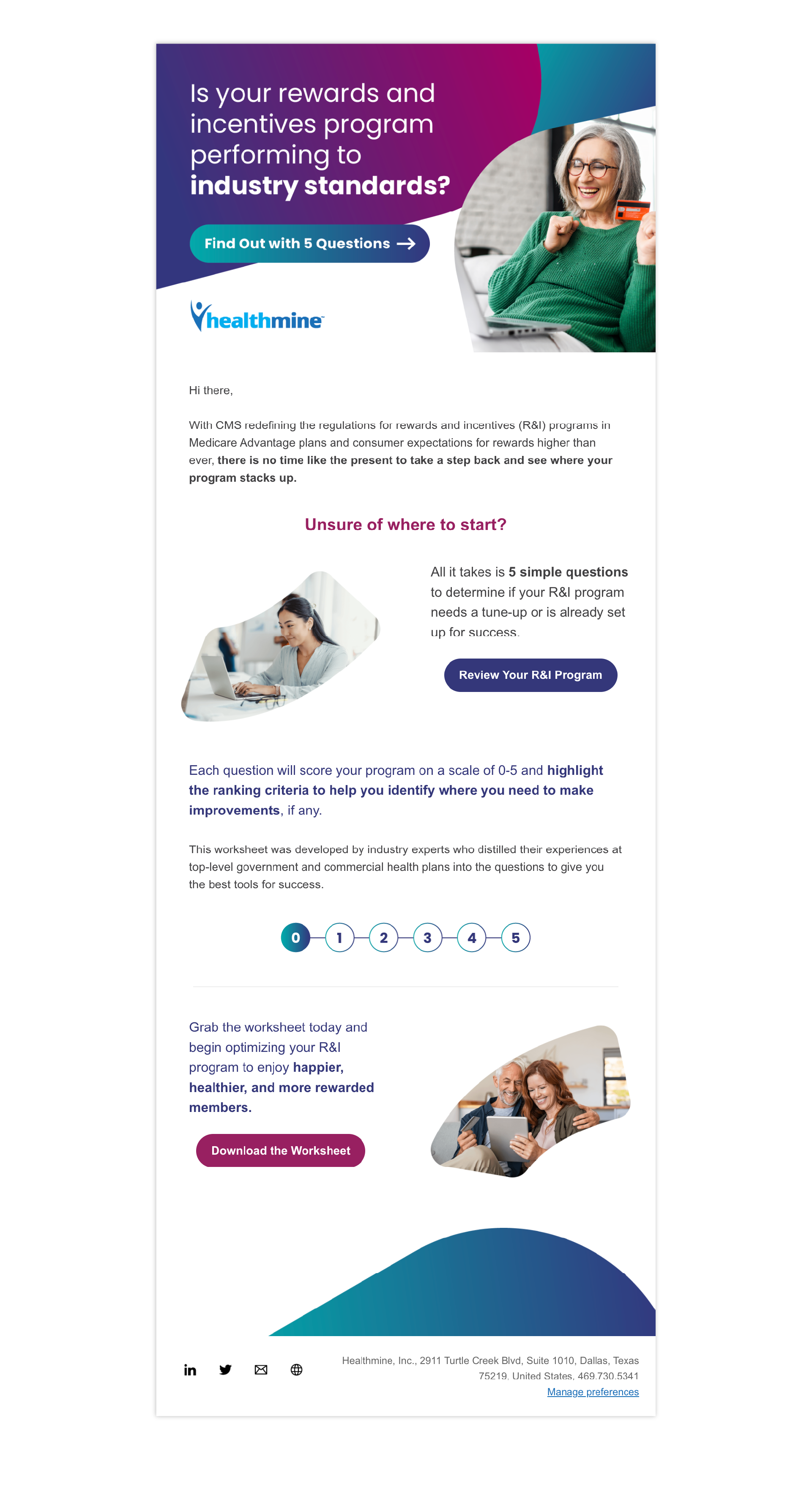 The “5 Critical Questions to Evaluate Your Rewards & Incentives Program” campaign was a targeted lead generation initiative designed to help Medicare Advantage plans assess the effectiveness of their rewards and incentives programs. The goal was to drive worksheet downloads while positioning Healthmine as a trusted authority in navigating CMS regulations and improving member engagement strategies.